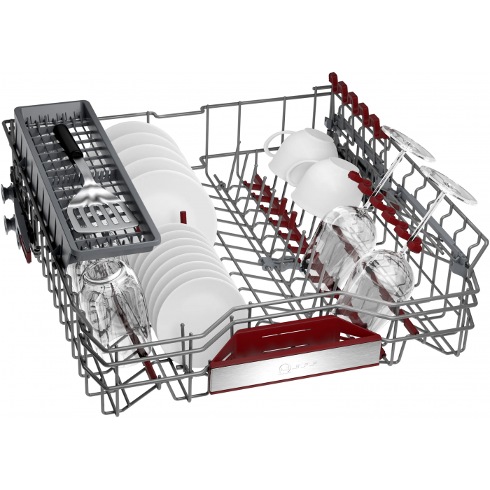 Gap Light/ Складывающиеся направляющие длятарелок в верхнем коробе (4x)/ Складные направляющие для тарелок внижнем коробе (4)/ Полка для длинных ножей в верхнем коробе/ Корзина для столовых приборов в нижнемкоробе