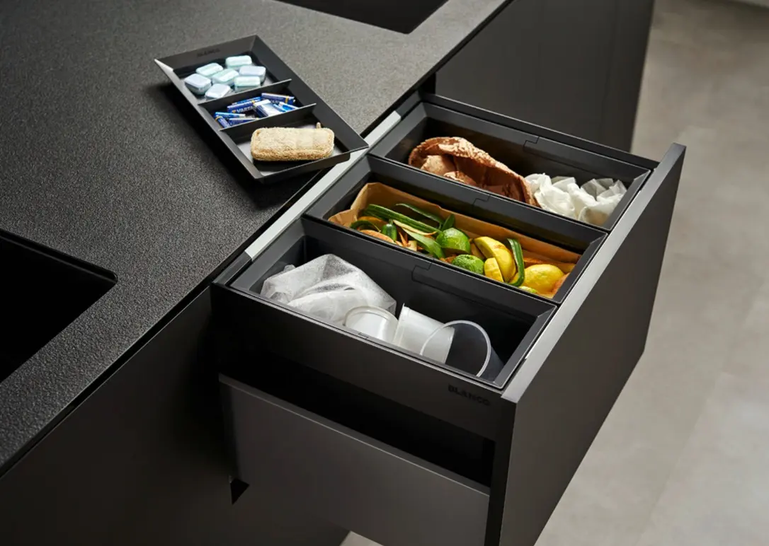 Система сортировки отходов FLEXON II 60/3 Low от Blanco воплощает философию бескомпромиссного качества, инновационного дизайна и функциональности, превращая самое активное место на кухне в продуманный, эргономичный и эстетичный центр для приготовления пищи.