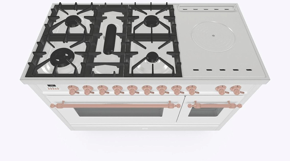 - Тип конфорок: 5 газовых, чугунная тарелка «Coupe de Feu» с кольцами