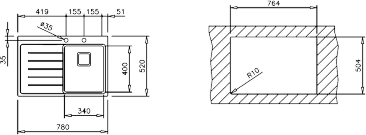 • Способ монтажа: врезной, крыло слева, чаша справа