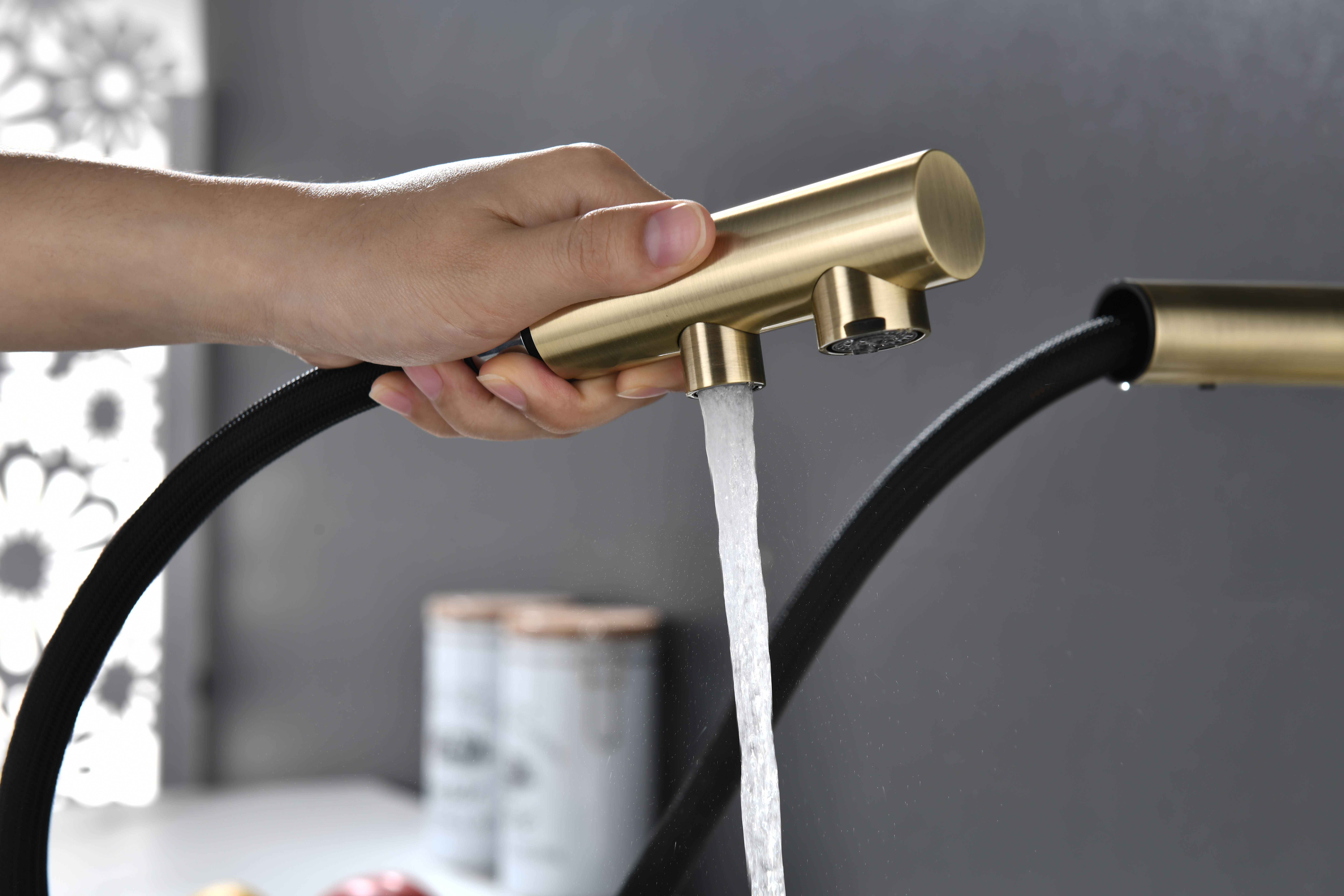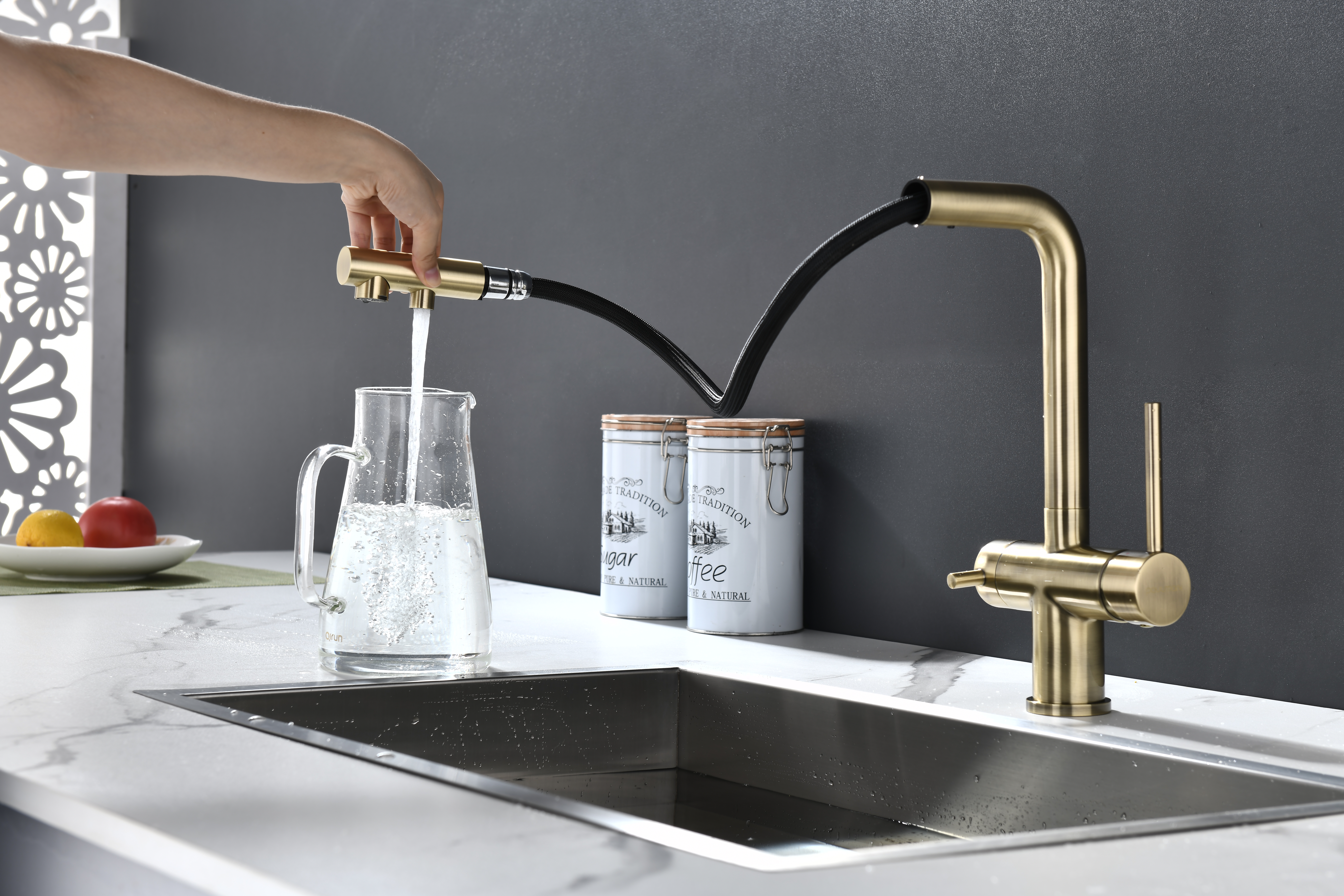 Смеситель оснащен гибким выдвижным изливом из нейлоновой оплетки, которая обладает отличной устойчивостью к истиранию и разрушению. Данная техническая особенность расширяет рабочую зону смесителя, позволяя пользоваться им с удобством в больших мойках, мойках с двумя чашами, или наполнять водой ёмкость на столе рядом с мойкой, в том числе питьевой водой.