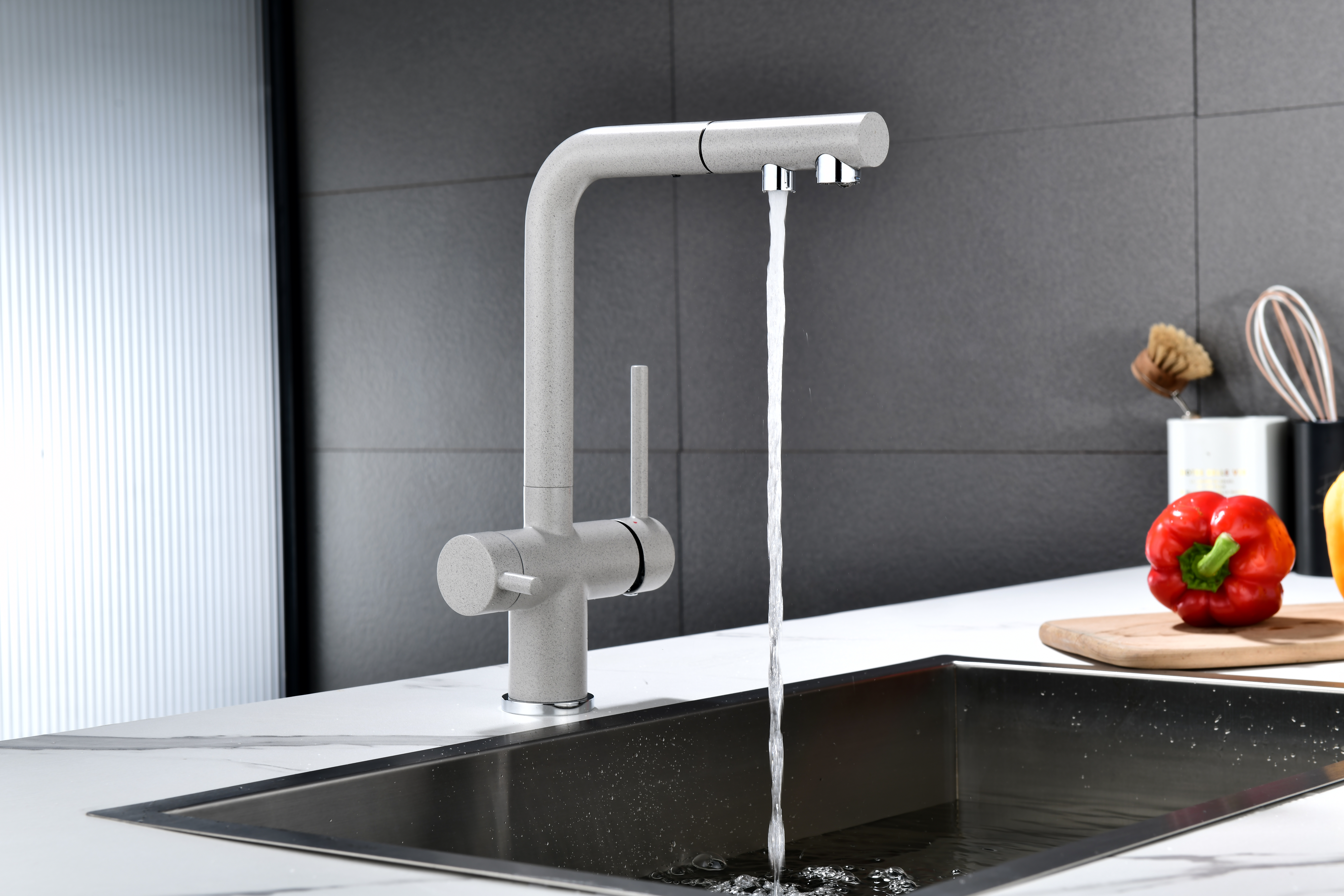 Смеситель оснащен гибким выдвижным изливом из нейлоновой оплетки, которая обладает отличной устойчивостью к истиранию и разрушению. Данная техническая особенность расширяет рабочую зону смесителя, позволяя пользоваться им с удобством в больших мойках, мойках с двумя чашами, или наполнять водой ёмкость на столе рядом с мойкой, в том числе питьевой водой.