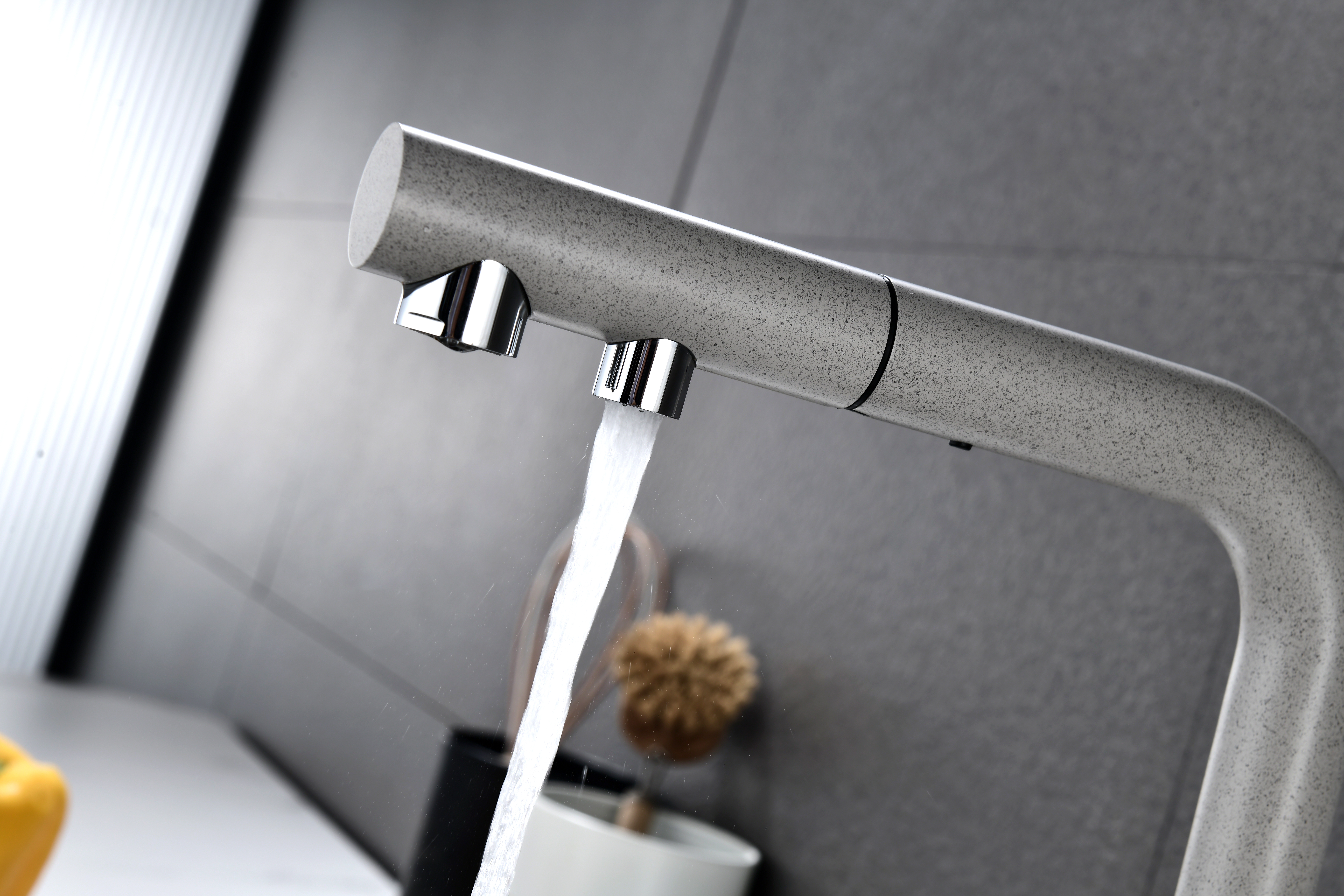 Смеситель оснащен гибким выдвижным изливом из нейлоновой оплетки, которая обладает отличной устойчивостью к истиранию и разрушению. Данная техническая особенность расширяет рабочую зону смесителя, позволяя пользоваться им с удобством в больших мойках, мойках с двумя чашами, или наполнять водой ёмкость на столе рядом с мойкой, в том числе питьевой водой.
